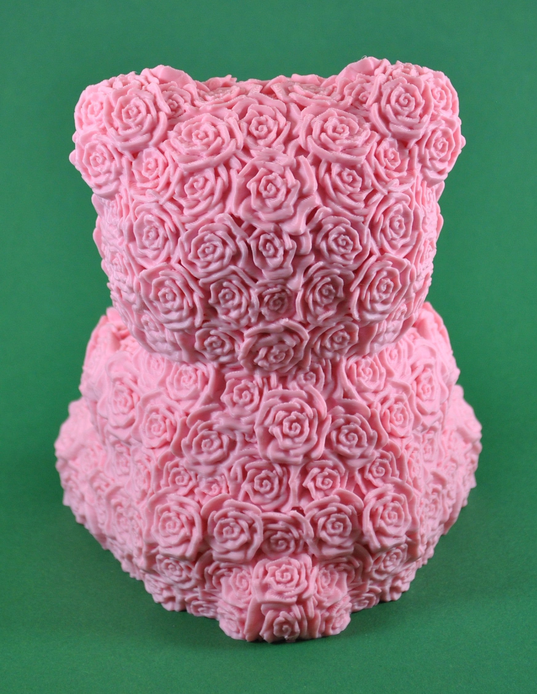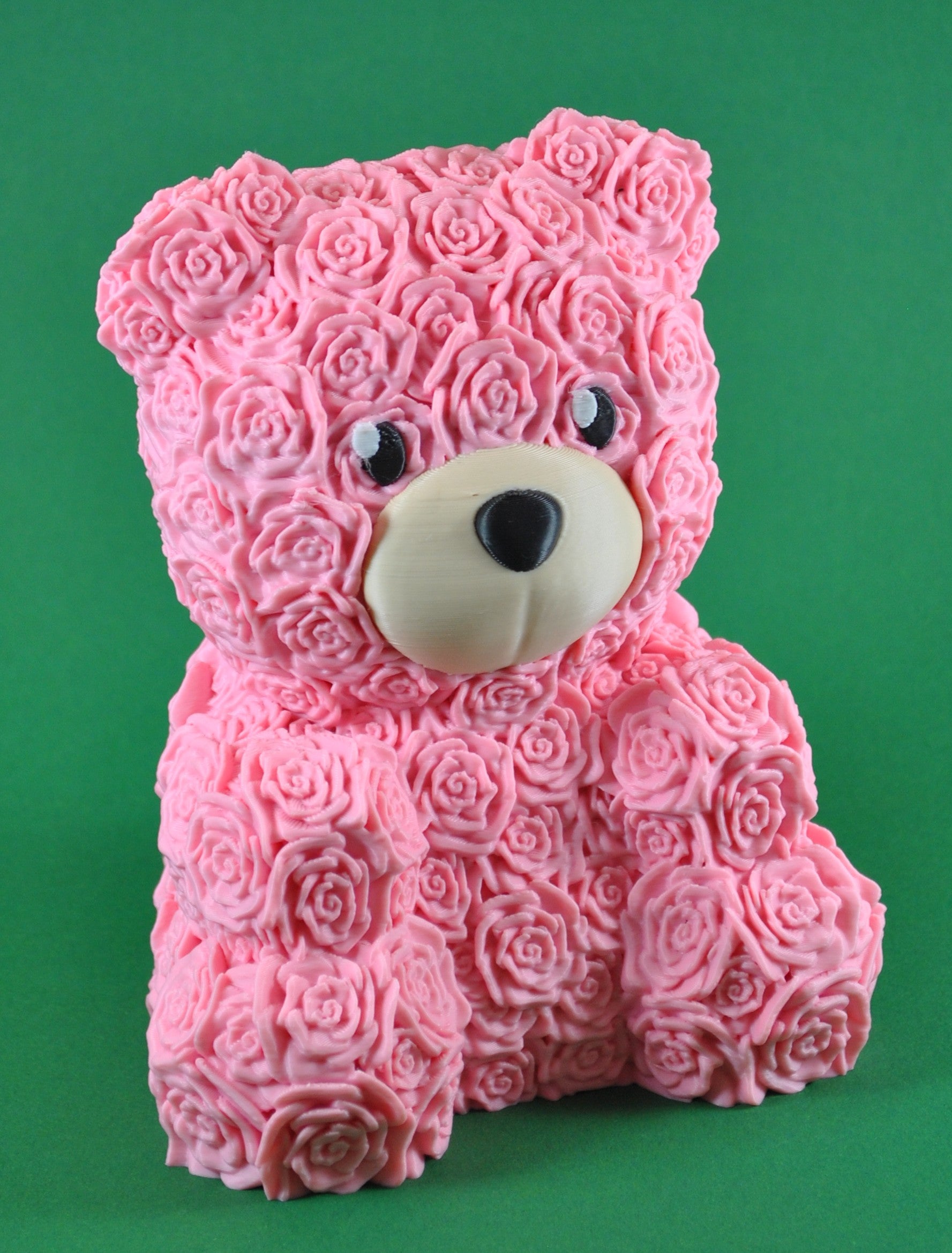 - Romantisches Design: Der Bär ist mit kunstvoll arrangierten Rosen bedeckt, die ihm eine luxuriöse und zugleich verspielte Textur verleihen.